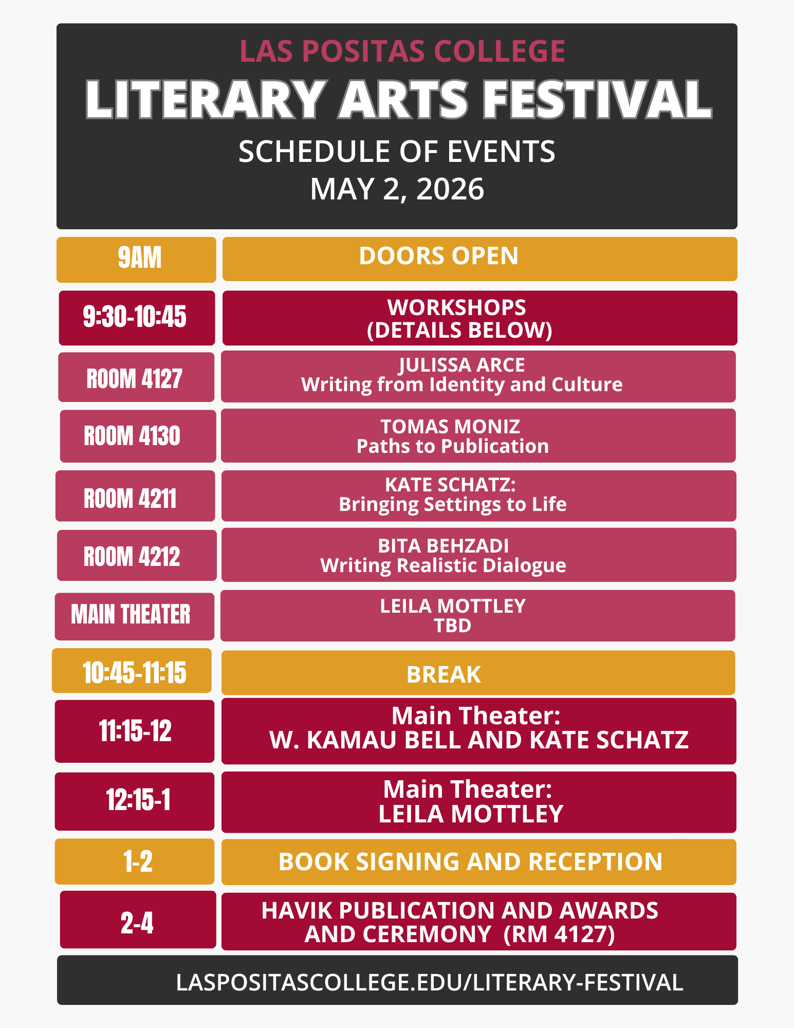 Havik, the Las Positas College Journal of Arts & Literature, celebrates the release of its 2026 edition with live readings and presentations by contributors, as well as awards in the categories of poetry, prose, visual art & photography, experimental work, and academic nonfiction. The in-person ceremony is open to all and will be streamed live online. For more information, visit the Havik website.