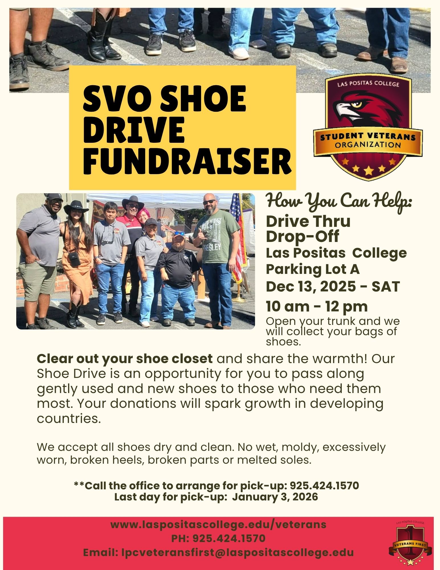 - For any questions or if you're unsure about the condition of the shoes you'd like to donate, feel free to call 925-424-1570 or visit us at the Veterans Resource Center.